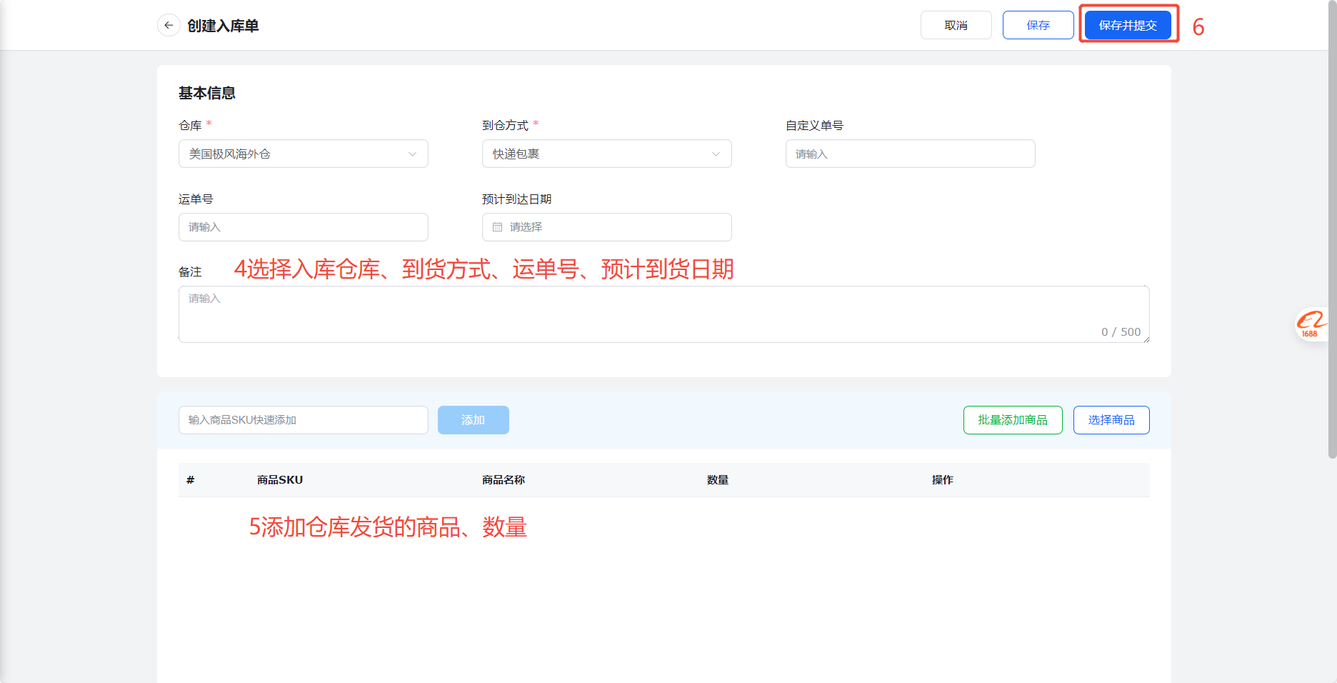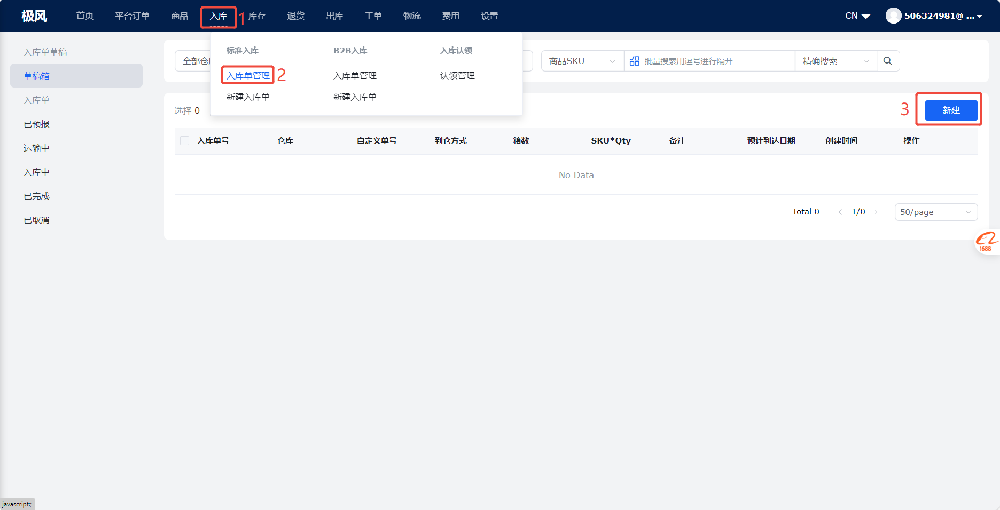 卖家发货给仓库,为避免仓库人工沟通费时费力、或者怕仓库遗忘,可以在【卖家端】(OMS)创建入库单,当发货后,自动推送发货单到仓库,仓库人员收到货后就清晰货主、商品,便于快速签收、质检、上架。 二、操作路径 登录卖家端(OMS)>入库>入库单管理>新建>选择收货仓库、到货方式、运单号、预计到达日期、发货的商品>保存并提交
