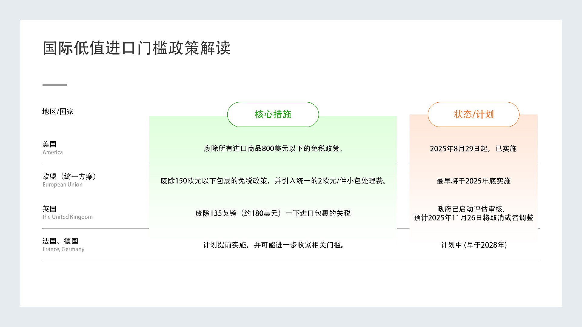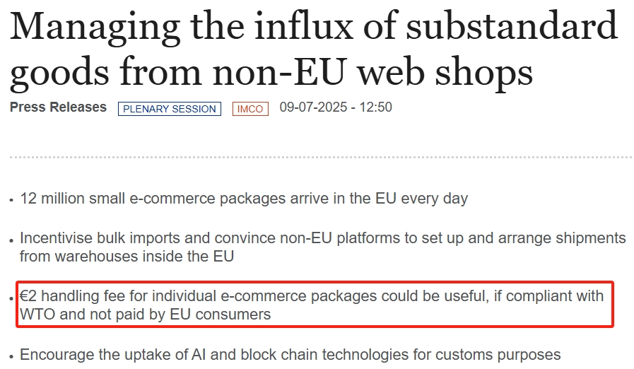 2025年7月,欧洲议会以压倒性票数通过了取消150欧元进口免税门槛的新规,最快将于2025年底正式实施。