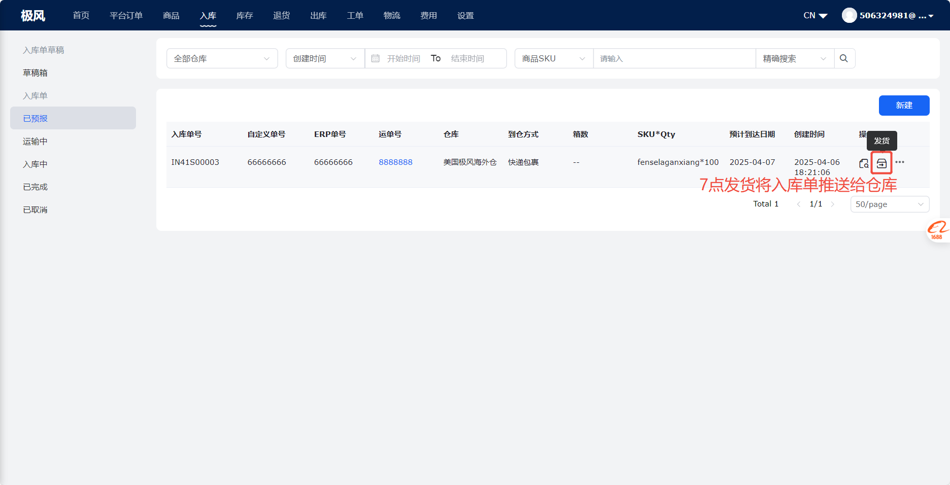 卖家发货给仓库,为避免仓库人工沟通费时费力、或者怕仓库遗忘,可以在【卖家端】(OMS)创建入库单,当发货后,自动推送发货单到仓库,仓库人员收到货后就清晰货主、商品,便于快速签收、质检、上架。 二、操作路径 登录卖家端(OMS)>入库>入库单管理>新建>选择收货仓库、到货方式、运单号、预计到达日期、发货的商品>保存并提交